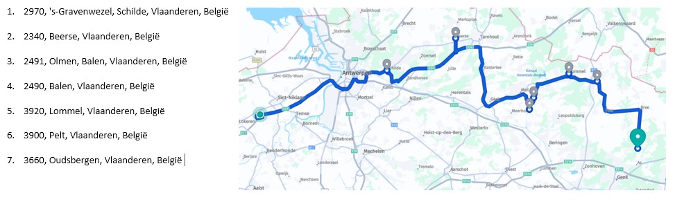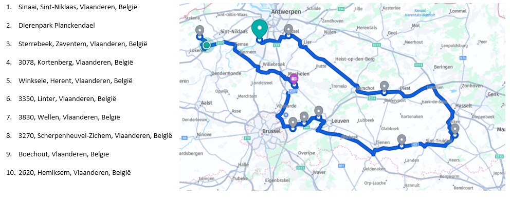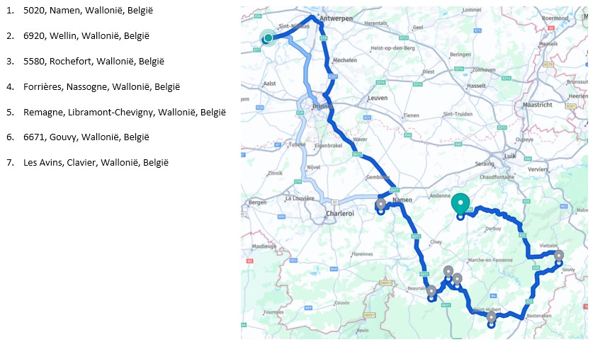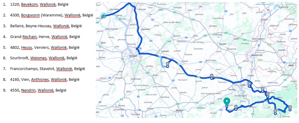 In de blauwe kolom linksboven zie je per stop een zone of gemeente, bijvoorbeeld "Antwerpen". Reken hiervoor: ongeveer 30 tot 45 minuten rijtijd vanaf Waasmunster plus ongeveer 15 minuten om de bestelling te lossen