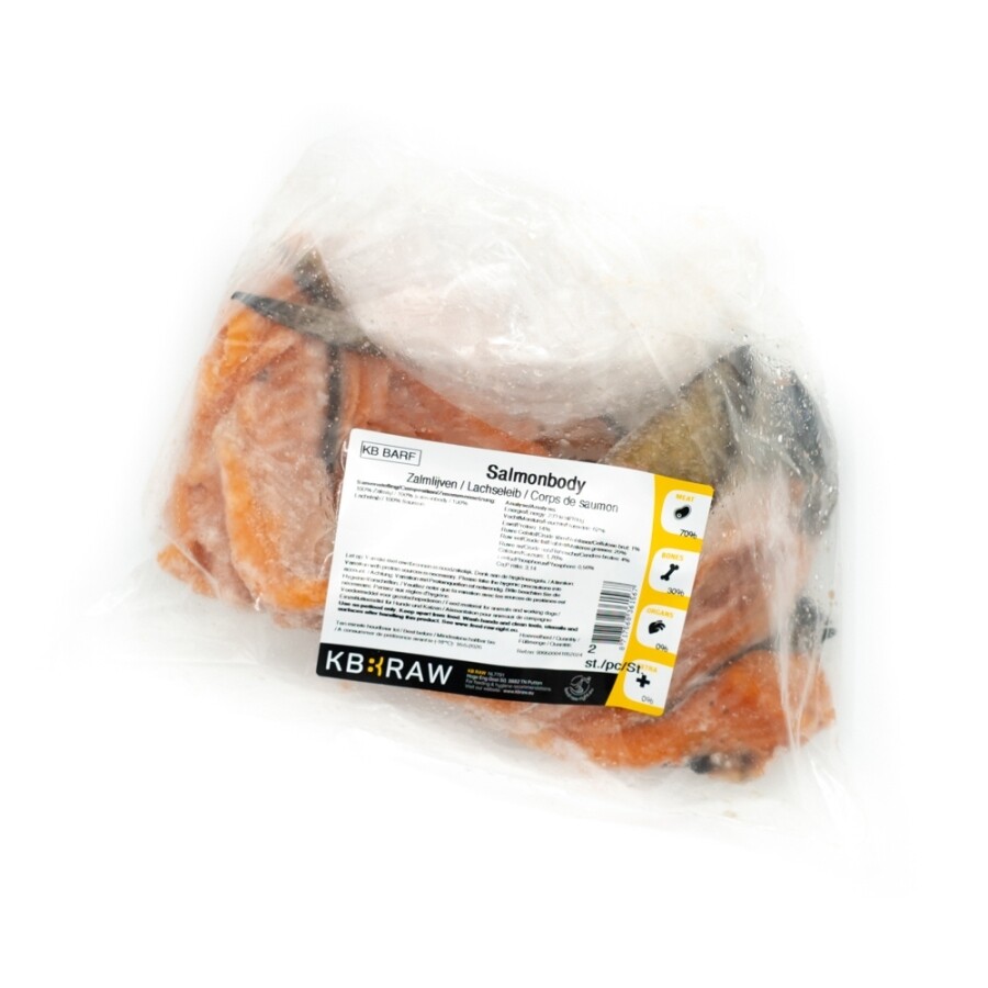 Les corps de saumon sont parfaitement adaptés pour être utilisés dans un menu BARF ou NRV. Un corps de saumon est un aliment complémentaire pour animaux de compagnie. En alternant les corps de saumon avec des os charnus, de la viande musculaire et des abats, un menu complet peut être composé avec ce produit.