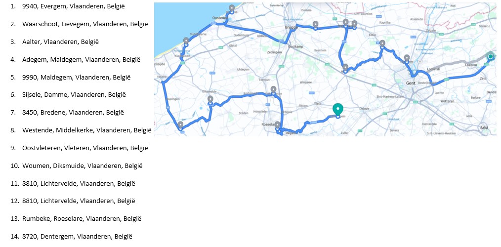 Dans la colonne bleue en haut à gauche, vous voyez pour chaque arrêt une zone ou une commune, par exemple "Anvers". Comptez pour cela environ 30 à 45 minutes de trajet depuis Waasmunster plus environ 15 minutes pour décharger la commande.