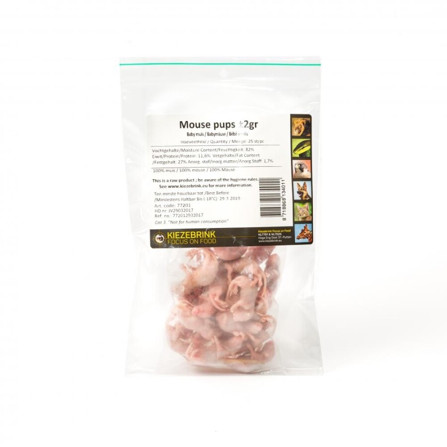 25 Babymuizen van 1 á 2g. Babymuizen zijn uitermate geschikt als voeding voor roofvogels, reptielen (kleine en grote slangen, tegus/tejus, baardagamen, varanen, waterschildpadden, agamen ...), katten en fretten.