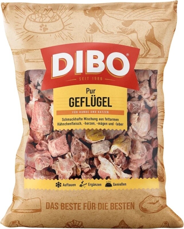 Dit heerlijke DIBO-gevogelte bestaat uit een ideale mix van mager kippenvlees, kippenhart, kippenmaag en kippenlever.
