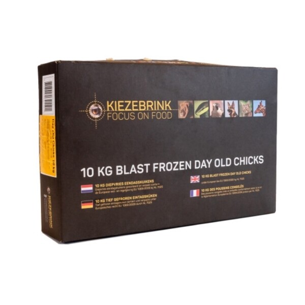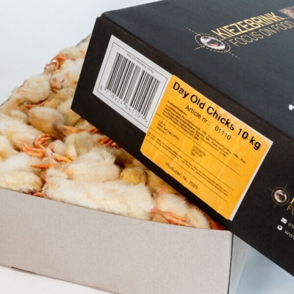 Een doos van 10 kg bevat ongeveer 250 eendagskuikens (ongeveer 40g per stuk).
