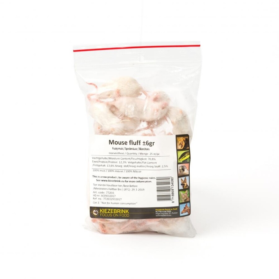25 Fuzzy muizen van 4 á 5 g. Fuzzymuizen zijn uitermate geschikt als voeding voor roofvogels, reptielen, katten en fretten. Ook zijn ze geschikt als snack voor honden.