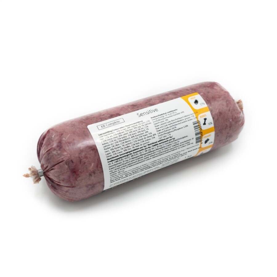 De KB raw Complete Sensitive mix is een mix van kalkoen, konijn en paard aangevuld met zalmolie en een premix van vitaminen en mineralen. De mix bevat enkel kalkoen, konijn en paard als eiwitbron. Dit zijn eiwitbronnen die minder vaak allergieën veroorzaken bij honden.