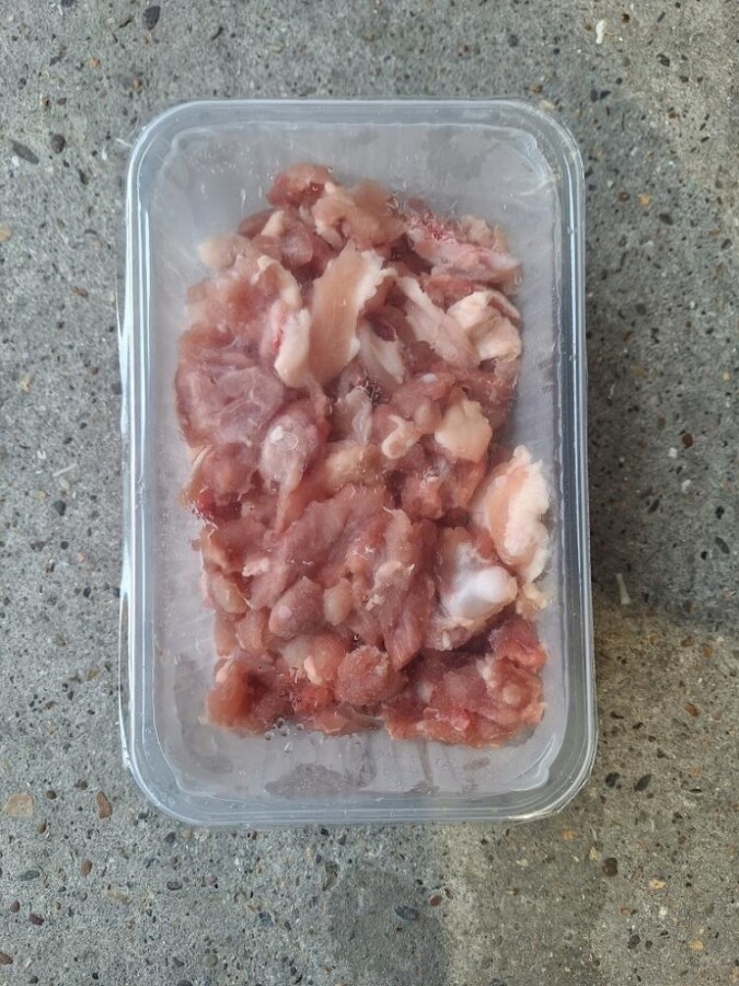Dit zijn karkas snijlingen m.a.w. stukjes die bij het opkuisen van de karkassen van het vlees worden afgesneden. Dit gaat dus om vlees met vet, vel en ook kleine botjes, nog aanwezig in het vlees na de machinale opkuis.