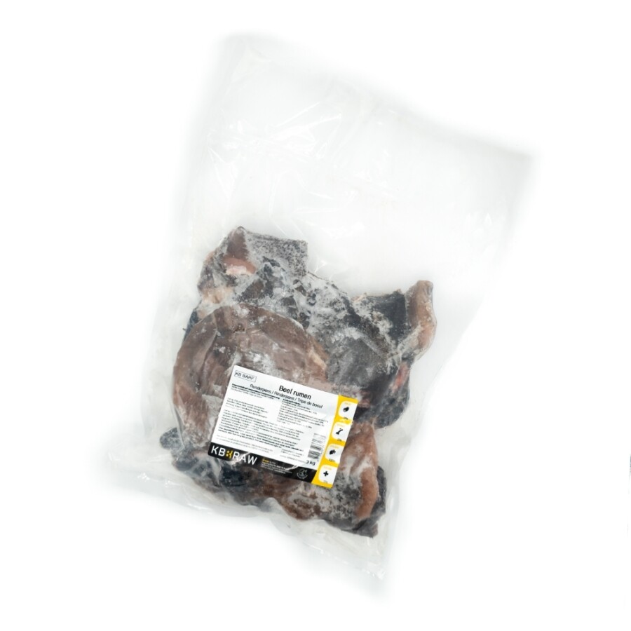 Runderpens stuk 3kg is een aanvullende voeding op basis van pens. Deze vers vlees voeding is uitermate geschikt om te gebruiken in een BARF schema wanneer je deze aanvult met vleesbot, spiervlees en orgaanvlees van andere diersoorten.