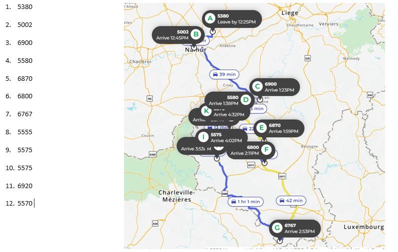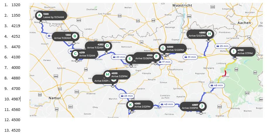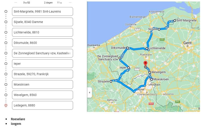 * Hoe kan u het uur van levering bij uw adres uitrekenen? U start bij Waasmunster om 9h (indien onze chauffeur op een ander tijdstip vertrekt dan zal dit bij het plannetje vermeldt worden). Dan telt u ongeveer de tijd daarbij tot de volgende stop die linksboven in de blauwe kolom vermeld staat bijvoorbeeld 'Antwerpen' dat zal ongeveer 30 a 45 minuten duren + daarbij komt ongeveer 15 minuutjes tijd om de bestelling te lossen. Momenteel zit u al aan 9h15 + 30 minuten + 15 minuten = 10h. Vervolgens telt u de tijd tot het volgende adres er bij en daar ook weer 15 minuutjes om de bestelling te lossen enzovoort. * Wij maken de routes via Google Maps waar slechts 10 gemeentes per keer kunnen op gezet worden. Indien onze chauffeur meerdere gemeentes dient aan te leveren, typen we die er manueel onder.