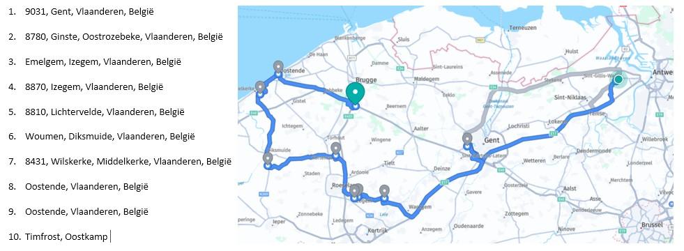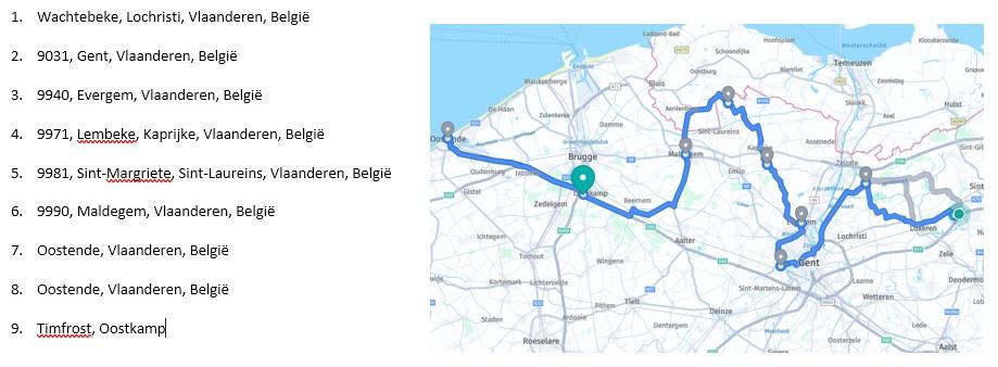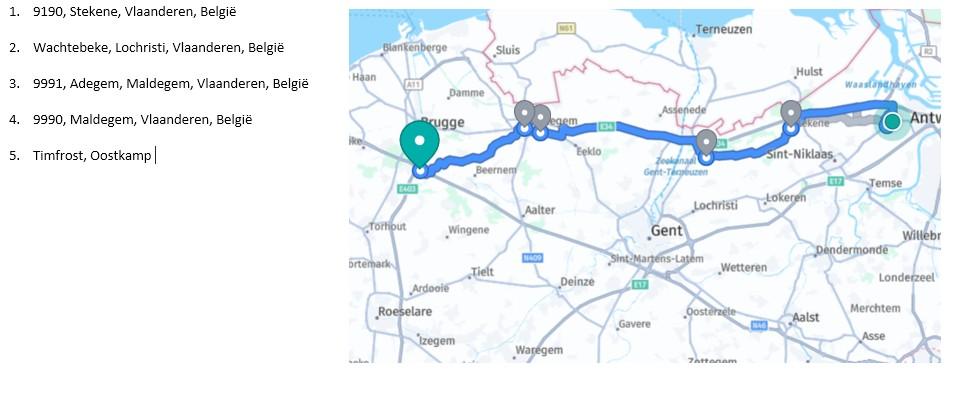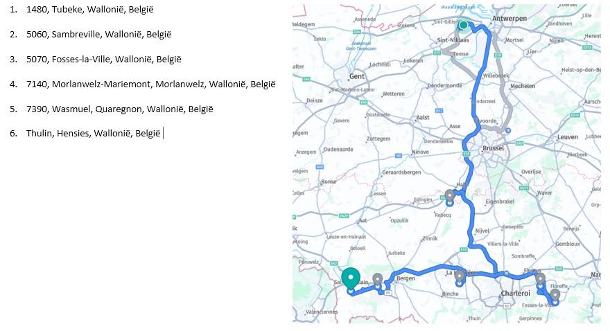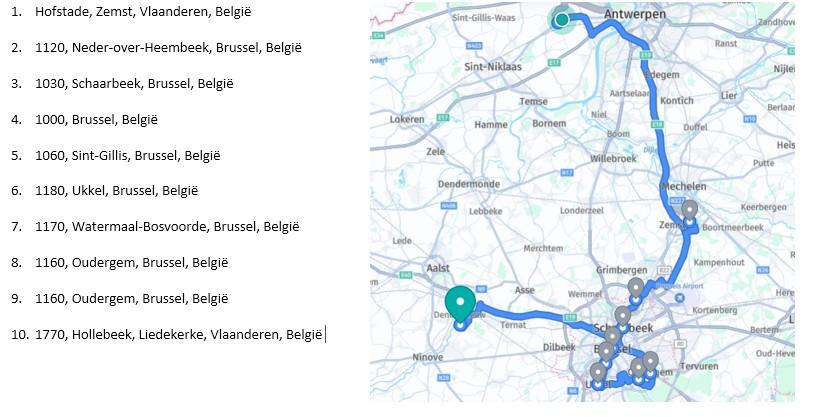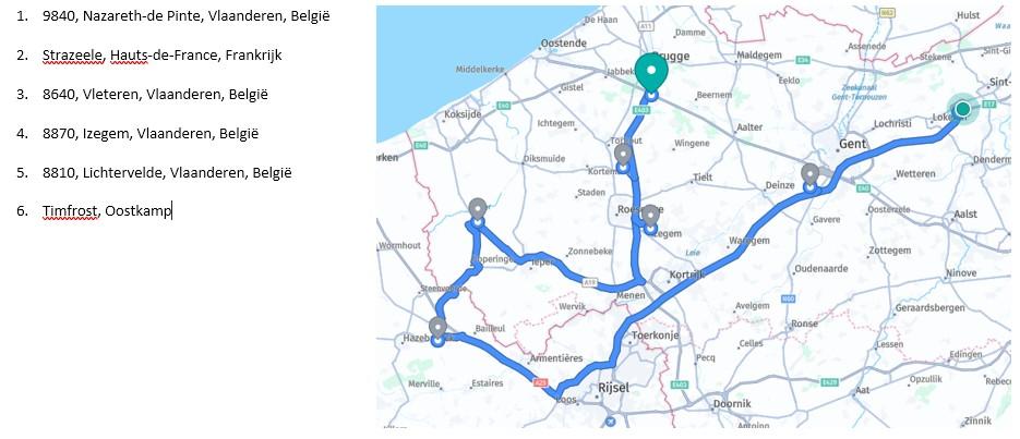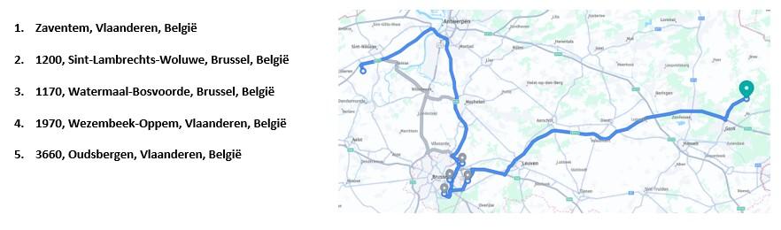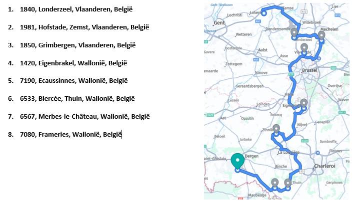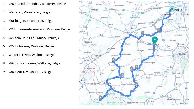 * Comment pouvez-vous calculer le délai de livraison à votre adresse ? Vous commencez à Waasmunster 9h (si notre chauffeur départ plus tard ou plus tôt nous allons le noter). Ensuite, vous comptez approximativement le temps jusqu'au prochain arrêt mentionné en haut à gauche dans la colonne bleue, par exemple "Antwerpen", qui prendra environ 30 à 45 minutes + environ 15 minutes pour décharger la commande. Pour l'instant, vous êtes déjà à 9h15 + 30 minutes + 15 minutes = 10h. Ensuite, vous comptez le temps jusqu'à la prochaine adresse et là encore 15 minutes pour décharger la commande et ainsi de suite.